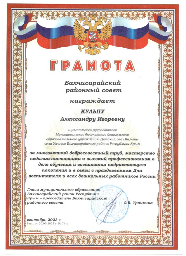 2017 год ГБОУ ДПО РК "Крымский республиканский институт постдипломного педагогического образования" по программе "Музыкальное воспитание в дошкольной образовательной организации в соответствии с ФГОС ДО" в объеме 72 ч.